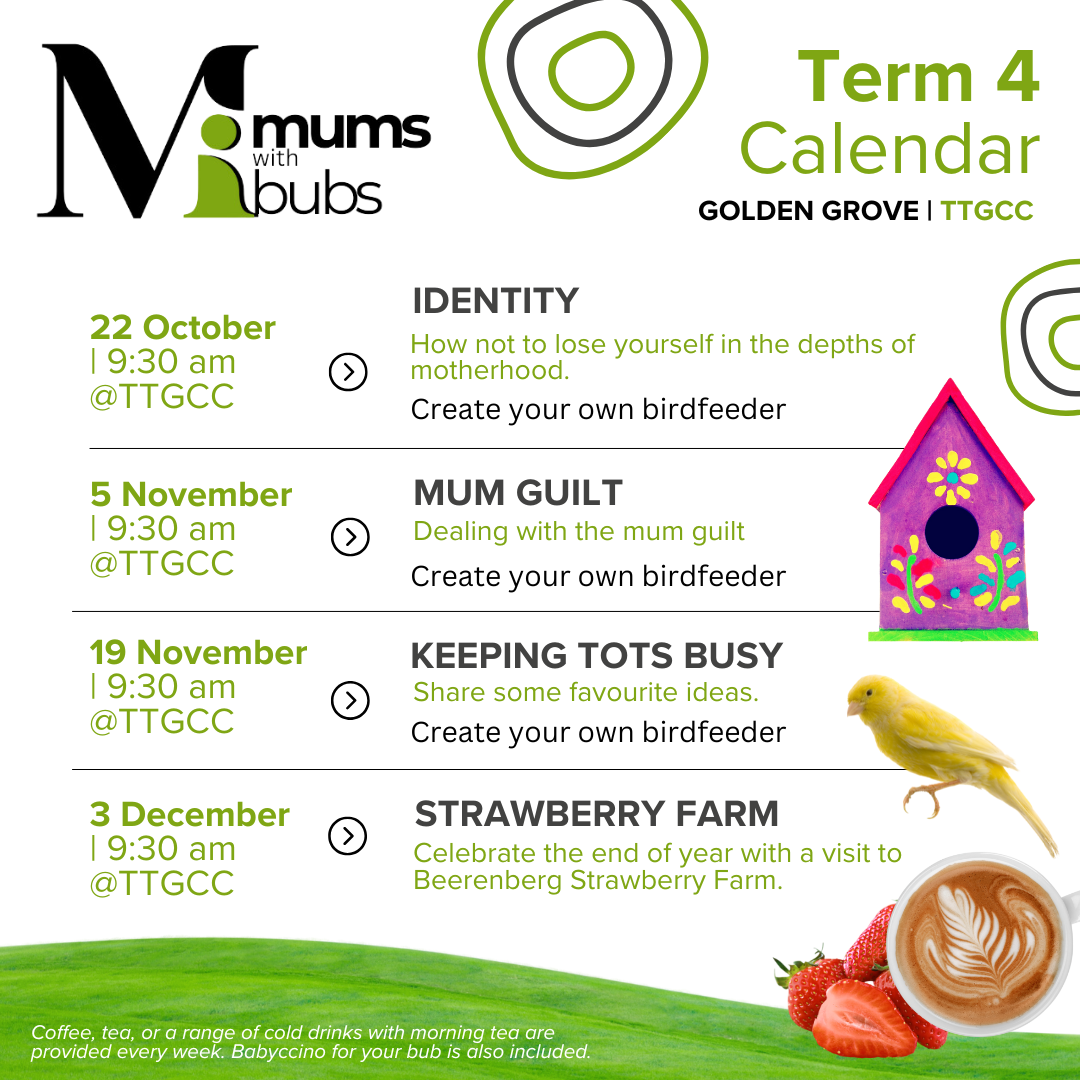 We want to support you, encourage you, and empower you so this group is more than just an opportunity to connect with other mums, it is also a time for you! Connect and recharge so you can be the best mum you can be.
